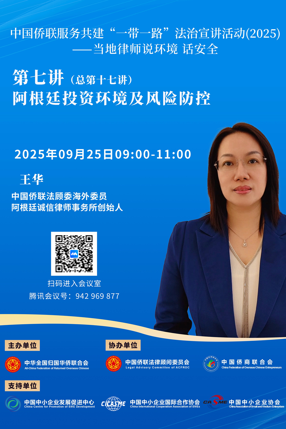 今年第七讲(总第十七讲)将于2025年9月25日(周四)9:00开播,由中国侨联法顾委海外委员阿根廷王华律师主讲。王律师毕业于阿根廷美洲大学,获得国际贸易硕士学位,持有律师执照和阿根廷国家公认中西文翻译资格证。王律师专注于公司法、海关法、国际贸易和移民法等,近年来在中资企业投标、重组、并购、索赔、公证等方面提供全方位法律服务,助力中资企业“走出去”。王律师还同时兼任阿根廷华侨华人妇女联合总会会长、中国驻阿根廷大使馆领事部法律顾问、阿根廷布宜诺斯艾利斯大学法学院特聘教授等职务。